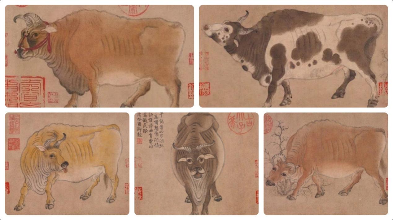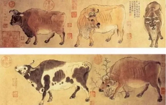 《五牛图》是唐朝韩滉创作的黄麻纸本设色画,又名《唐韩滉五牛图》, 该作品现藏于北京故宫博物院。作品中所绘五头神态各异的牛,或行,或立,或俯首,或昂头,动态十足。可贵的是,画面上没有背景衬托,完全以牛为表现对象,勾勒牛的线条虽然简洁,但是画出的筋骨转折十分到位,牛口鼻处的绒毛细致入微,目光炯炯的眼神体现了牛儿们温顺而又倔强的性格。在鼓励农耕的时代,以牛入画有着非常的含义。五头牛每一头都有不同的寓意,分别代表了勤劳致富、勤恳忠实、诚信友好、年富力强、事业兴旺。