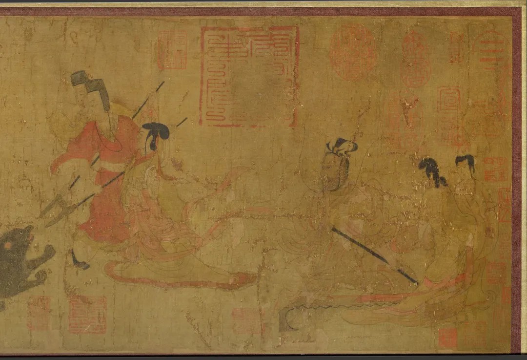 此段是画汉元帝率宫人幸虎圈看斗兽,有一黑熊突然跃出围栏,冯婕妤挺身护主的故事。画卷中的冯婕妤长带宽衣,虽聘婷苗条,但面对跑过来的黑熊毫无惧色,临危不惧的精神表现得很突出。而那两个武士虽手执武器,一个在张口大声呵喊,一个用力刺向黑熊,但面露惊惶之色,与冯婕妤的昂首挺立形成鲜明的对照,更突出地表现了冯婕妤的勇敢与镇静。