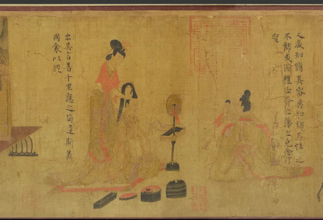 此段画的是两个妇女对镜梳妆,用来表现“人咸知修其容,而莫知饰其性”。其中一个妇女正对镜自理,镜中映出整个面容,巧妙地展现出那种顾影自怜的神态。另一妇女照镜,身后有一女子在为其梳头,梳头的少女表现的尤为秀丽。三个人的姿态各不相同,却都让人感觉到幽雅文静,姿态端庄。画面充盈着魏晋女性浓郁的生活气息。