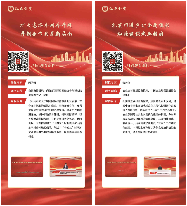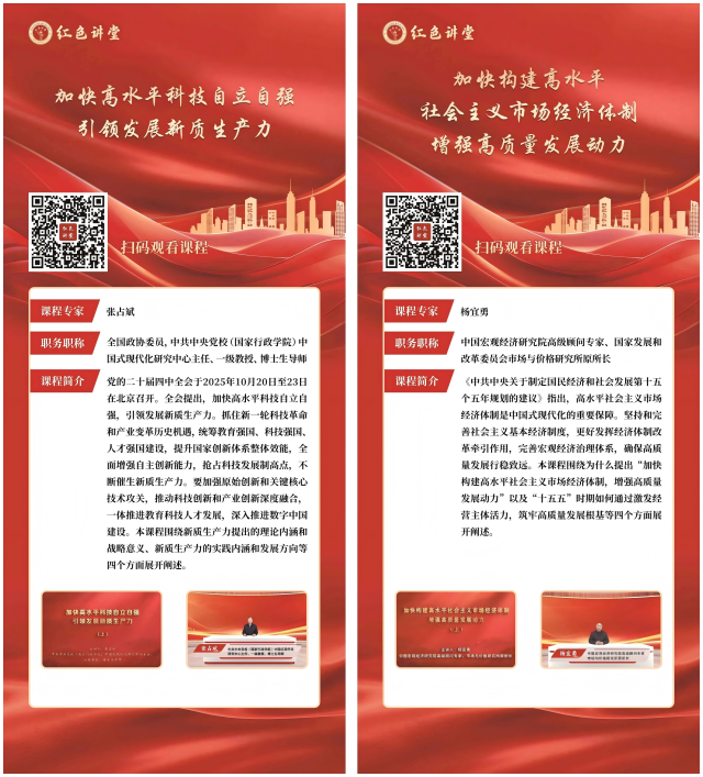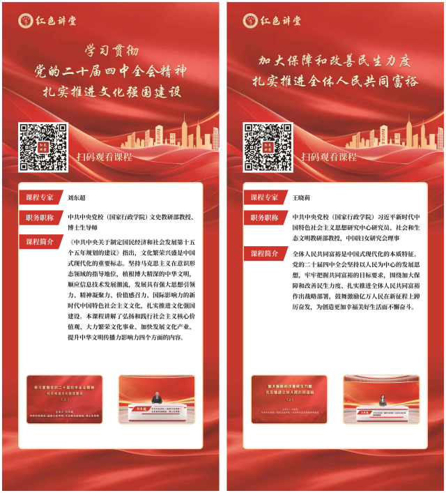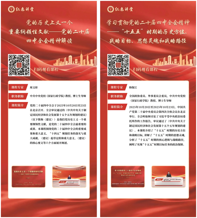 为便于广大师生深入学习领会全会精神,把思想和行动统一到全会精神上来,“红色讲堂”数据库开放了由权威专家学者精心录制的专题讲座,讲座围绕全会精神及“十五五”规划建议进行详细解读,广大师生可于活动期内到图书馆现场扫描展板上的二维码观看讲座视频,也可以扫描以下图片中的二维码观看相关讲座。本次活动共推出10组讲座,每组讲座包含多个微视频,视频可扫码收藏学习,不限观看次数。